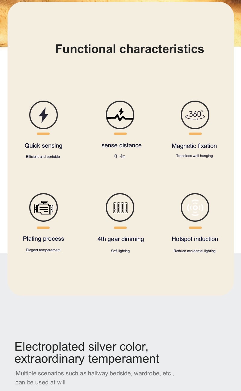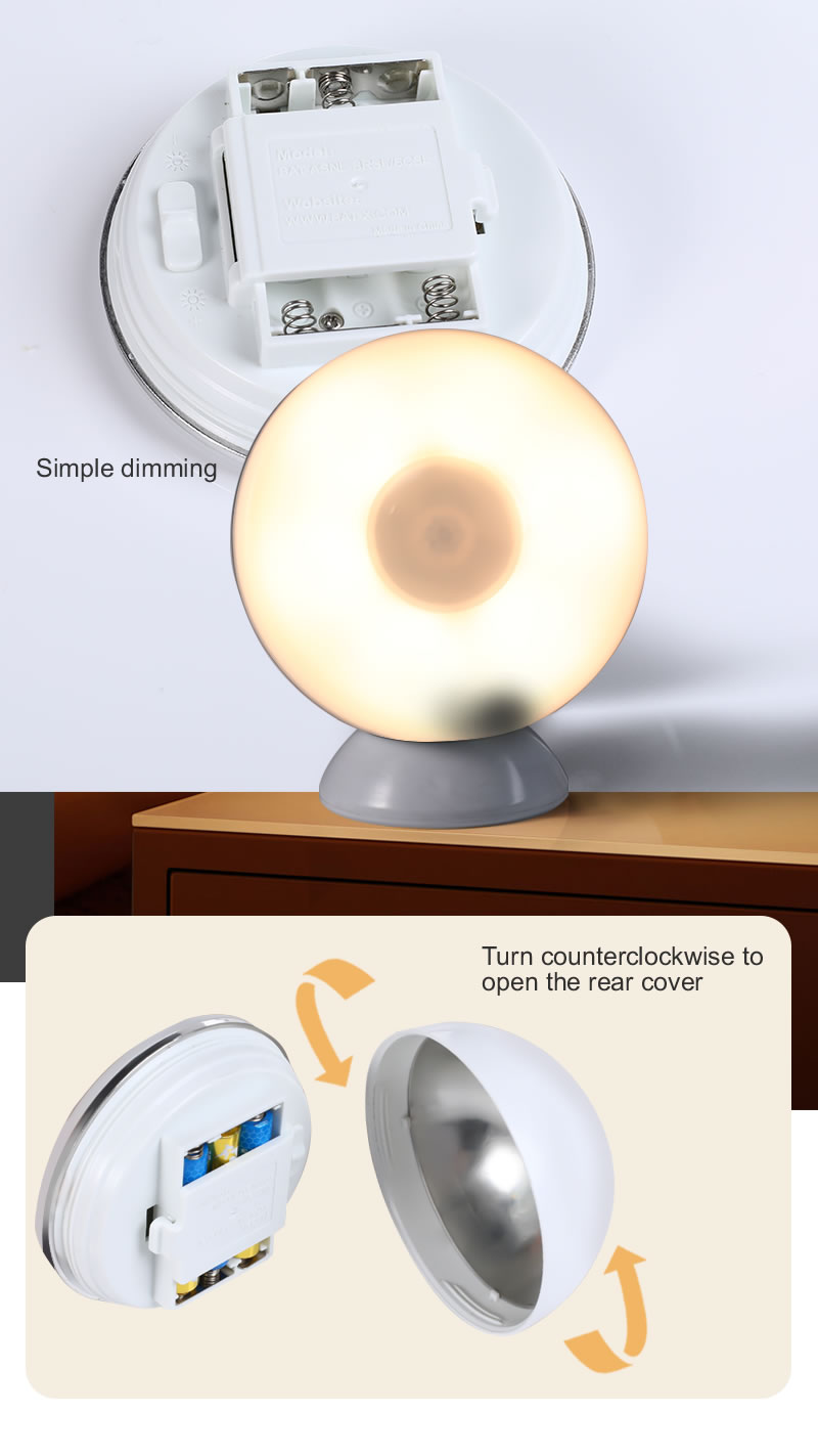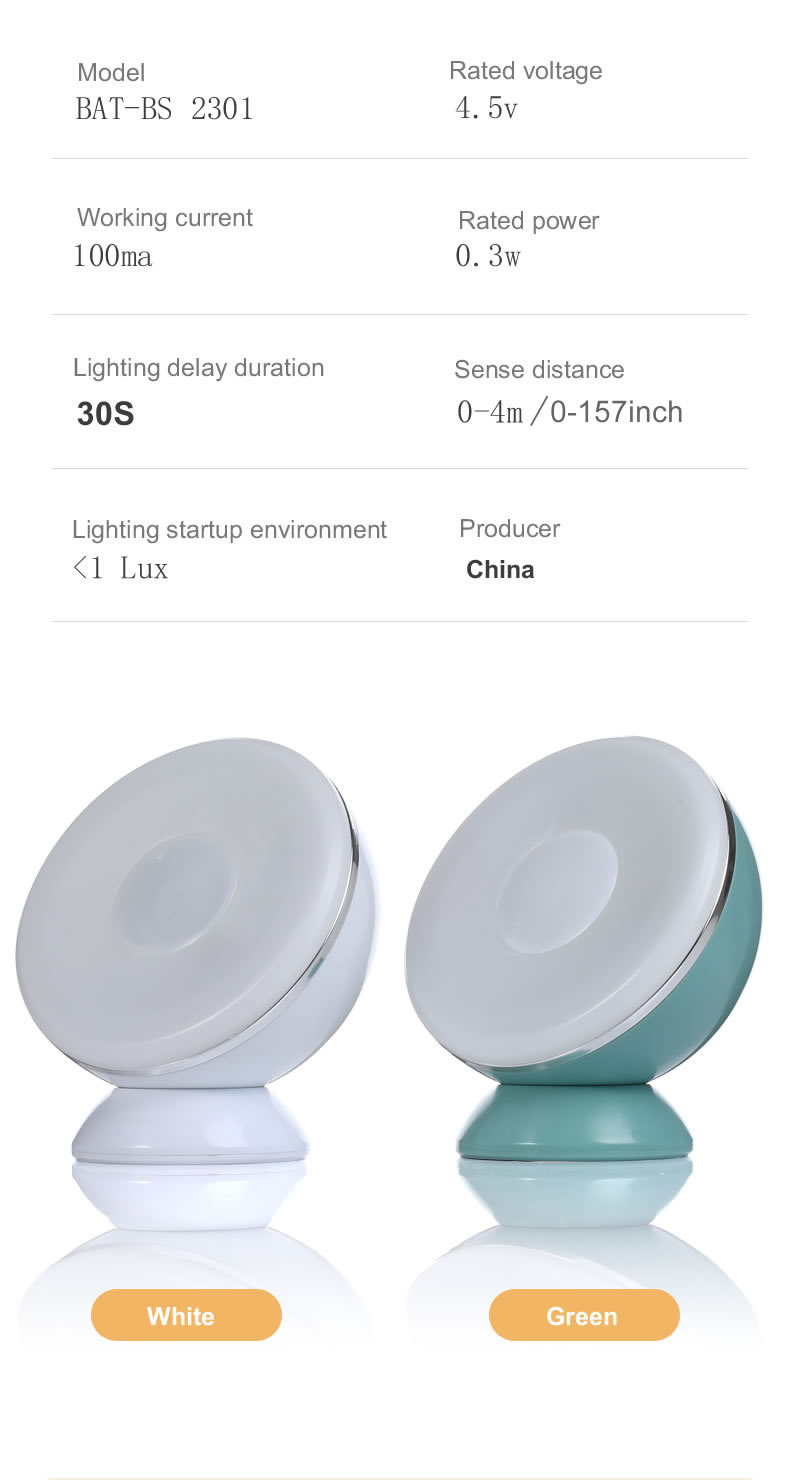 Product material: ABS Sense distance: 0~4M Battery: 3*AAA battery Light source: Warm tone Product size: ≈80x80x60mm Package size: 85x85x65mm
